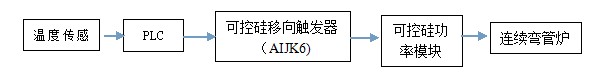 温度传感器测出连续弯管炉内的实时温度后给PLC,与PLC的设定值比较后输出一个4-20mA的电流信号给可控硅移向触发器,可控硅移向触发器输出触发信号给可控硅功率模块从而精确控制连续弯管炉内的温度。