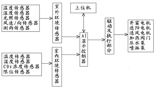 AI总线系统对蔬菜大棚作物生长的主要环境参数如温度、湿度、光照、通风进行测控,实现在线闭环调节。实现对蔬菜的生长环境、技术管理、生产管理优化的科学决策。系统结构如图1所示。