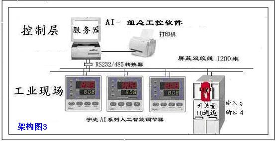 在系统中由于AI系列仪表的出色性能,宇电又开发出基于AI仪表并具备现场总线特性的AIFCSV9.0计算机监控系统。AI仪表相当于现场总线系统中的各个控制单元,利用RS485作为现场通讯总线,采用宇电自行开发的AIBUS通讯协议,可在上位机上实现100%仪表功能操作如实时读取测量值、给定值、设置参数、自动/手动无扰动切换、调整手动输出值、启动/运行/停止程序,并具备开关量输入/输出操作能力。开放式结构随意添加控制仪表。
