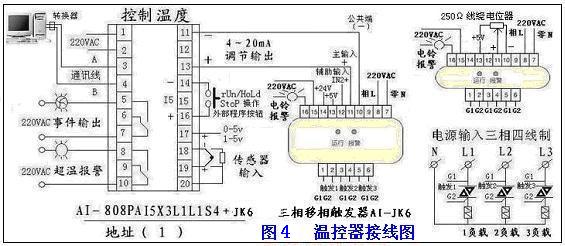 根据系统的要求我们可以选用各种仪表类型如AI-808PAI5X3L1L1S4+AIJK6,利用AI-808P的主输出作为AIJK6的控制信号,来控制加热输出,AI-808P智能调节器增加了30+20段时间程序控制功能,前30段可编程为自动跳转执行,实现循环控制,采用先进的模块化设计,具备5个功能模块插座:辅助输入、主输出、报警、辅助输出及通讯,