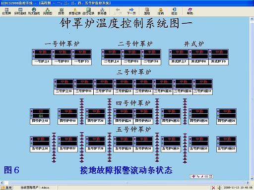 当罩式炉产生接地故障,接地故障报警滚动条状态在流程图上显示接地状态。