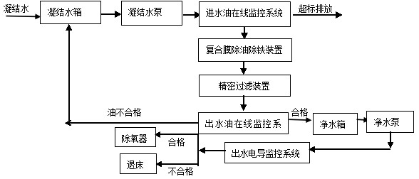 工艺流程:控制外来凝结水进入凝结水箱,有凝结水泵经过除油除铁、过滤系统,对合格的水进入净水箱,由净水泵打入工艺系统管网中,对于不合格的再循环回收。