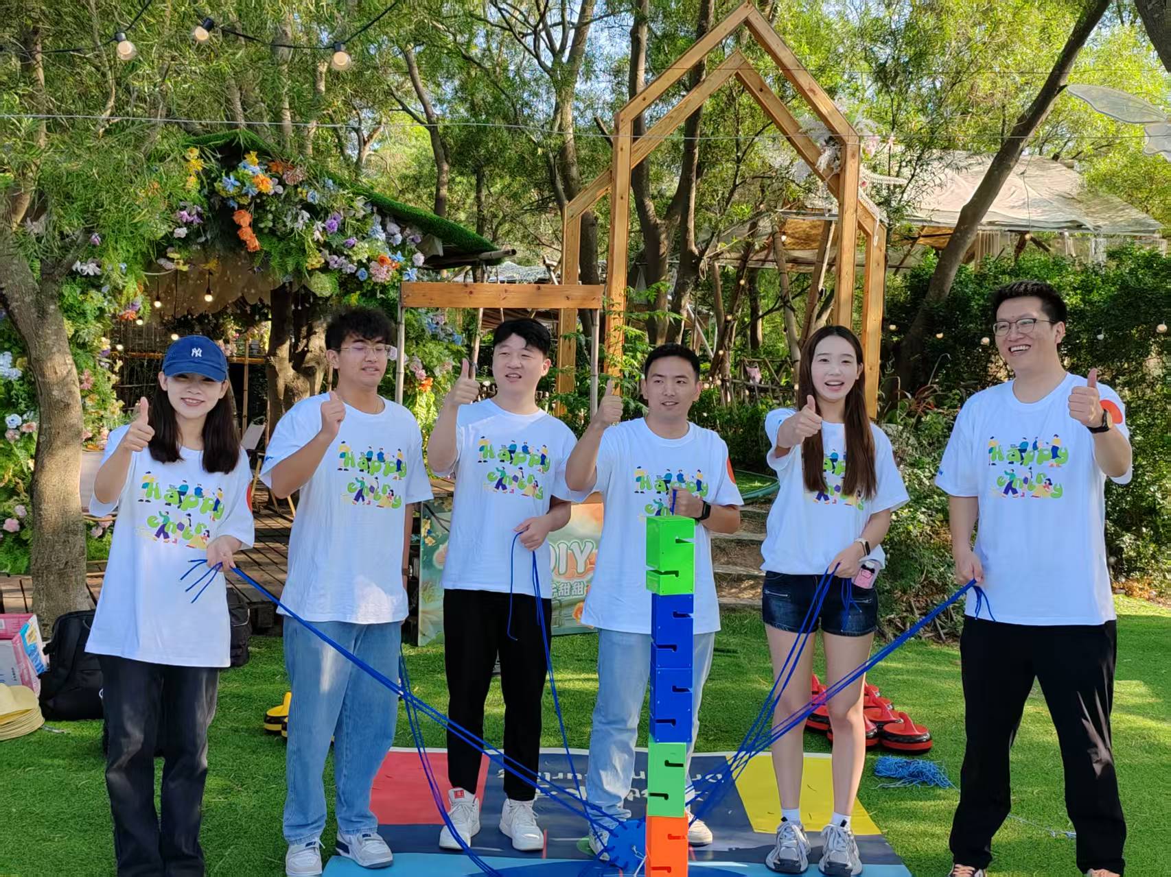 在合力筑塔环节,团队成员需要通力协作,用绳索控制塔钩,将一块块积木稳稳垒高。这不仅考验着每个人的专注力,更需要团队的默契配合。当积木塔在共同努力下拔地而起,那份成就感让每个团队成员的脸上都绽放出灿烂的笑容。
